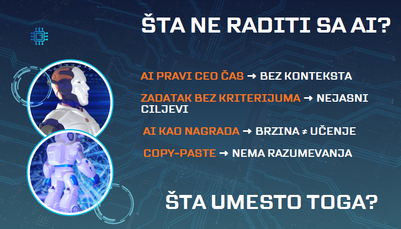 Коучинг центар и „АИ навигаторке“ су организовали једнодневну радионицу 15. новембра у Београду. Радионица је посвећена примени вештачке интелигенцију у учионици, а део је Ерасмус+ пројекта AINavigatorsEmpowering Teachers for The АI Еrа, KA220-SCH-7C1CB3AA. Садржај ове радионице, међутим, није био усмерен искључиво на АИ алате и њихово коришћење. Обрађена је улога АИ у образовању, заблуде и истине о АИ, етички оквир за употребу вештачке ителигенције. Радионици је присуствовала професорка Катарина Марковић.